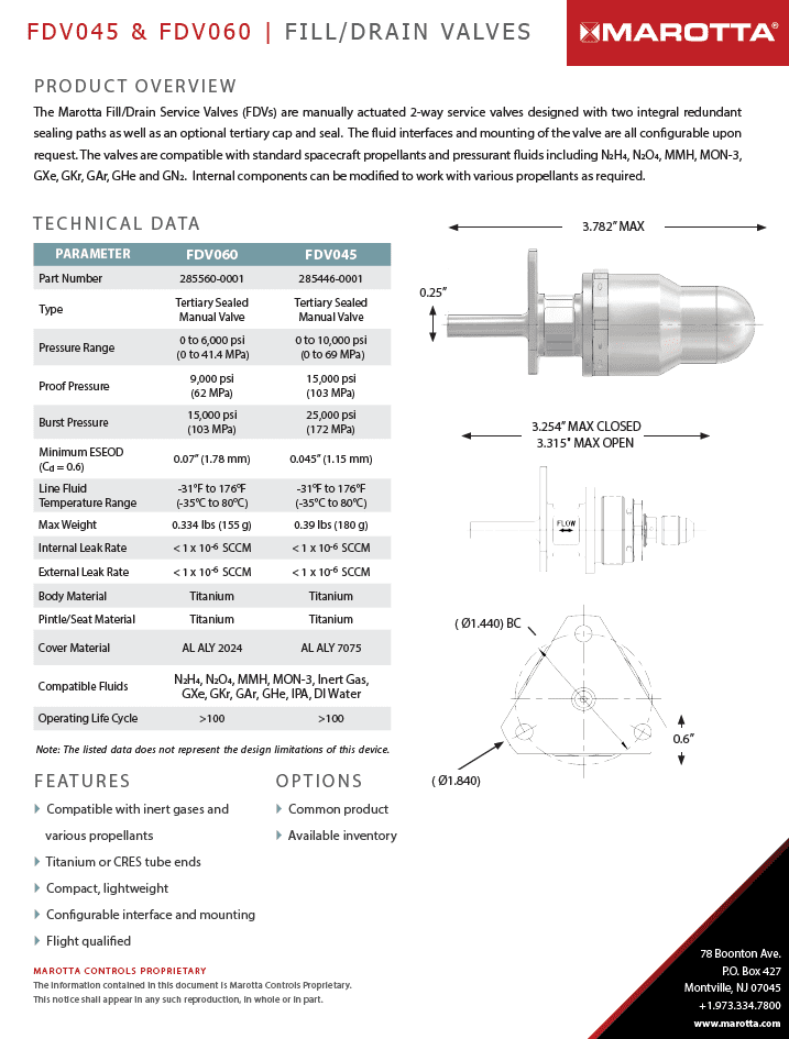 FDV060 features a load limiting design to increase allowable open/close cycles and simplify customer operation. The base design is easily configurable to customer needs – differing operating pressures, line fluids, and other specifications can all be met. Marotta leveraged our experience in higher volume commercial spaceflight valve production to offer these components at a highly competitive cost with reduced lead times.